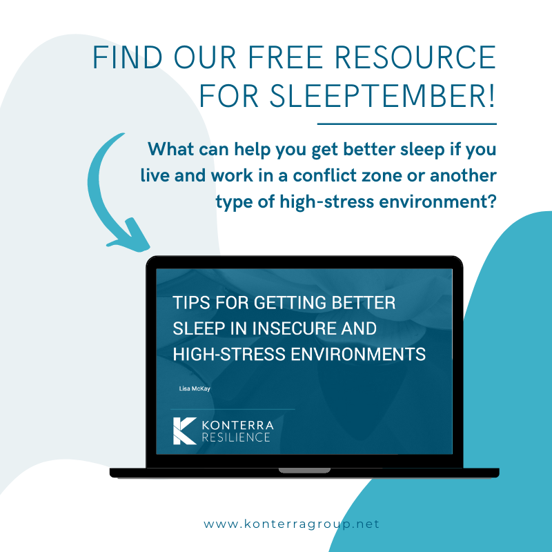 Recently, several counselors in the KonTerra Group network were looking for resources on getting better sleep. The catch? The individuals they were supporting lived and worked in conflict zones and other high-threat environments. For these people, some of the normal advice about good sleep hygiene doesn’t apply or falls very short of acknowledging contextual disruptions and dangers.