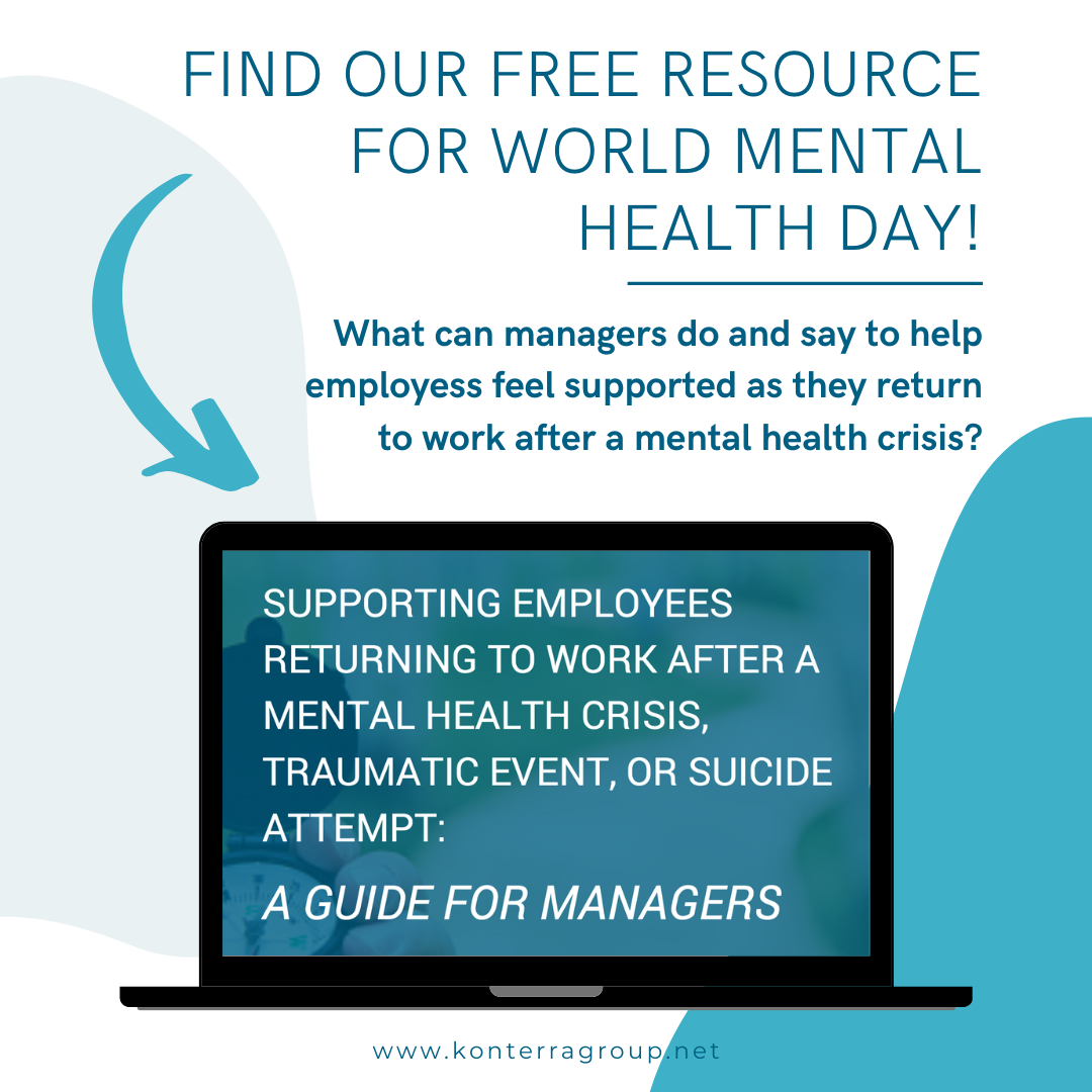 The KonTerra Group’s new resource offers practical strategies for managers seeking to support employees as they return to work after being away for some time due to a mental health crisis, traumatic event, or suicide attempt.