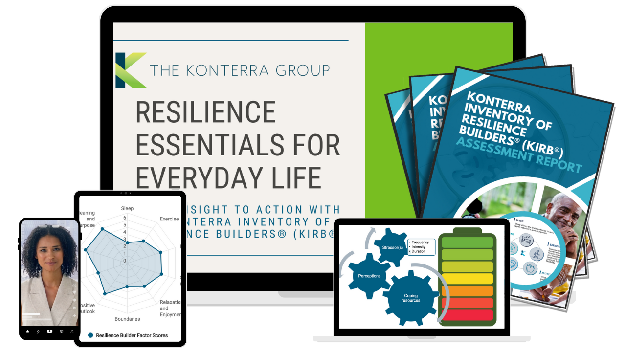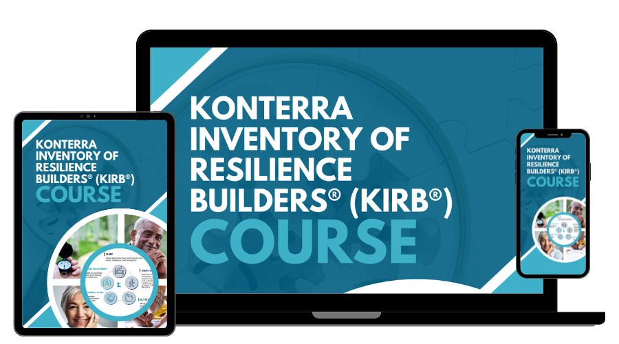 The course combines the KonTerra Inventory of Resilience Builders® (KIRB®) with short, focused video lessons in the Resilience Essentials for Everyday Life course that guide participants from insight to action—helping them identify priorities, adjust habits, and make changes that are realistic and sustainable.