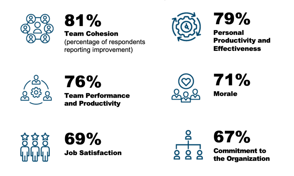 Data collected from more than 1000 staff members participating in Organizational Resilience engagements* showed significant improvement in multiple areas, including: